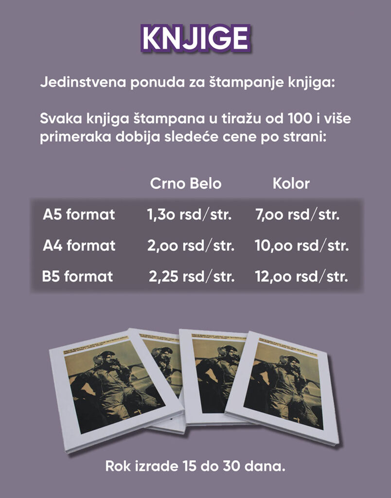 Autori knjiga više ne moraju da posreduju sa izdavačkim kućama pri štampi knjiga već mogu da dođu direktno u digitalnu štampariju i na licu mesta se o svemu dogovore i pogledaju probni otisak. U našoj digitalnoj štampariji, pored kompletne izrade knjige, možete dobiti i uslugu pripreme (preloma) knjige za štampu, što znači da možete doneti rukopis bilo u elektronskoj ili pisanoj formi, a na nama je da Vaše zahteve po pitanju tipografskog oblikovanja i tehničke izrade knjige sprovedemo u delo. Kada je u pitanju tehnička izrada knjige razlikuju se dva osnovna tipa knjiga – meki i tvrdi povez.