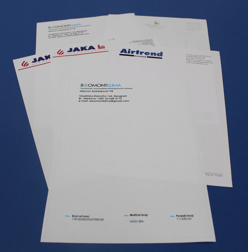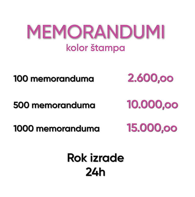 Copy Studio Vam nudi štampu memoranduma na papiru gramature 80 g/m2 A klase bilo u boji bilo u crno-beloj tehnici. Možemo štampati blanko memorandume samo sa podacima Vaše firme u određenom tiražu, tako da ste kasnije u mogućnosti da samo doštampate tekst pisma po potrebi na svom kancelarijskom štampaču.