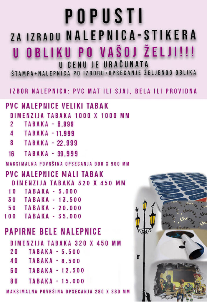 Nalepnice – stikeri svih oblika i dimenzija na raznim podlogama.